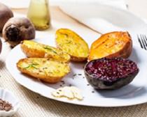 pour 4 personne(s) - 4 betteraves fraîches - 6 pommes de terre (taille moyenne) - un ou deux ignames (selon la taille) - 2 branches d`estragon ou de romain - graines de sésame - huiles d`olive - sel, poivre |