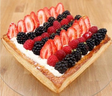 pour 8 personne(s) Pour la pâte feuilletée rapide - 300 g de farine - 240 g de beurre - 5 g de sel - Eau Pour la crème pâtissière - 50 cl de lait - 2 gousses de vanille - 4 feuilles de gélatine - 5 oeufs - 90 g de sucre - 40 g de fécule de maïs Pour la chantilly - 50 cl de crème liquide - 50 g de sucre glace Pour le dressage - 300 g de fraises - 300 g de framboises - 1 citron vert - 1 barquette de mûres |