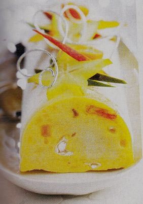 | Préparation : La veille: chemisez un moule à bûche «gouttière» de film alimentaire ou de papier sulfurisé. Coupez les fruits confits au couteau en tout petits dés. Concassez grossièrement la meringue. Faites ramollir très légèrement le sorbet à la mangue et mélangez-le aux fruits confits. Remplissez immédiatement lie moule de sorbet à la mangue aux 2/3 de sa hauteur, creusez une rigole au centre et garnissez-la de meringue concassée puits recouvrez de glace jusqu`au haut du moule. Lissez la surface, filmez et placez au congélateur jusqu`au lendemain. Le jour même: démoulez la bûche en a retournant sur un plat de présentation, décorez-la de fines lamelles de fruits exotiques. Replacez la bûche 1 heure au congélateur avant de la servir coupée en tranches. |