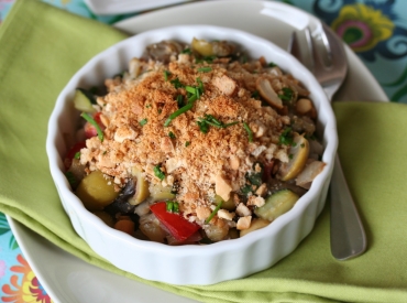 | Préparation : 1. Pelez et émincez finement l’oignon et l’ail. 2. Rincez l’aubergine et la courgette, et tranchez-les en petits morceaux. 3. Dans une grande casserole ou une sauteuse, faites revenir les légumes avec l’huile et du sel pendant 10-15 minutes à feu moyen. 4. Pendant ce temps, concassez les tomates, tranchez les olives en deux, émincez le poisson en morceaux, puis mixez les petits pains grillés avec les noix de cajou de façon à obtenir des miettes grossières. 5. Préchauffez le four à 200° C (th. 6-7). 6. Quand les légumes sont cuits, ajoutez-y les tomates, les olives, et le poisson, et salez encore un peu. 7. Déposez la garniture dans un grand plat ou dans des cassolettes individuelles. 8. Recouvrez de miettes, enfournez environ 10 minutes et dégustez parsemé de brins de ciboulette ciselés. |