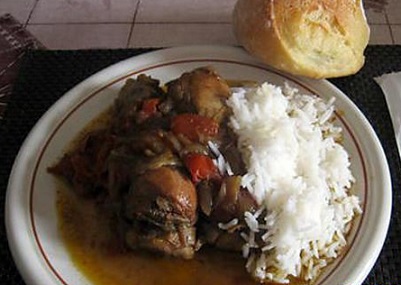 | Préparation : Dans une casserole large mettre suffisamment d`huile d`olive. Faites revenir les oignons, ajoutez le poulet coupé en morceaux avec le massalé et le cumin, laissez cuire. Ajoutez les tomates coupées, saler, mettez le piment, laissez cuire à feu doux jusqu`à ce que le poulet soit bien tendre. Si besoin rajouter un peu d`eau. Accompagnez avec du riz créole. |