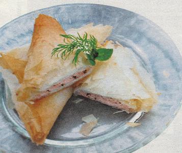 | Préparation : Préchauffez le four à 200°C (th. 6/7). Mixez ensemble le saumon, le fromage frais et la feta. Ajoutez les oeufs battus, le persil et la menthe. Salez et poivrez. Faites fondre le beurre. Placez une feuille de brick sur un plan de travail propre ou un torchon bien sec. Badigeonnez-la avec un pinceau de beurre fondu. Faites de même pour l`autre feuille et superposez-la sur la première. Découpez les feuilles superposées en 2, puis encore en 2. Déposez 1 c. à soupe de farce au saumon au centre de la feuille de brick pliée. Repliez la feuille sur elle-même en formant un triangle avec un angle droit. Répétez l`opération pour les autres feuilles. Déposez les pitas sur la plaque du four légèrement huilée. Faites cuire 15 à 20 min. |