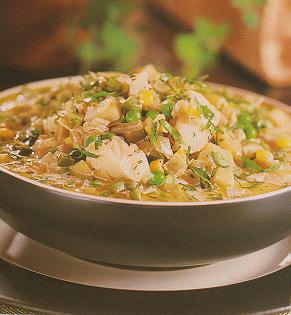 pour 4 personne(s) - 3 cuil. à soupe d`huile - 1 cuil. à café de graines de cumin, écrasées - 1 cuil. à café de thym séché ou d`origan - 1 oignon, coupé en dés - 1/2 poivron vert, épépiné et coupé en dés - 1 patate douce, coupée en dés - 2 à 3 piments verts frais, épépinés et très finement hachés - 1 gousse d`ail, très finement hachée - 1 litre de bouillon de poulet - 400 g de filets de vivaneau rouge, sans la peau et coupés en morceaux - 25 g de petits pois surgelés - 25 g de maïs surgelé - 12,5 cl de crème fraîche liquide sel et poivre - 3 cuil. à soupe de coriandre fraîche hachée, en garniture |