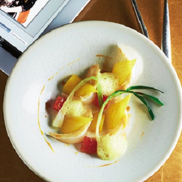 | Préparation : Poser les filets de saint-pierre dans une poêle antiadhésive avec de l’huile d’olive, et les faire cuire 5 secondes de chaque côté. Les retirer de la poêle, les couper en lanières d’un centimètre d’épaisseur et les réserver. Couper finement le fenouil dans le sens de la longueur, le faire cuire avec la pincée de curcuma, 10 cl d’eau et quelques gouttes d’huile d’olive, 3 ou 4 minutes (jusqu’à ce qu’il soit fondant). Retirer la peau du pamplemousse, puis lever les quartiers. Récupérer le jus et l’ajouter à la cuisson du fenouil avec la gelée de piment. Servir en intercalant pamplemousse, fenouil et lanières de poisson. |