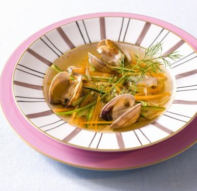 | Préparation : Rincez les coquillages pour éliminer le sable. Ecrasez les grains de cardamome et la badiane. Pelez le gingembre, l’oignon et l’ail. Hachez-les et faites-les blondir dans l’huile. Saupoudrez avec les épices et mélangez. Ajoutez les coquillages et laissez-les ouvrir sur feu vif. Eliminez les coquilles, réservez quelques coquillages entiers. Filtrez le jus puis faites-le bouillir. Pelez et émincez finement les carottes et les courgettes. Ajoutez-les au bouillon parfumé, laissez cuire 2 minutes puis ajoutez la chair des coquillages. Servez décoré des coquillages entiers réservés et de brins d’aneth. |