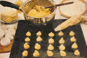 | Préparation : Mettre, dans une casserole à fond épais, 1/4 de litre d`eau, le sel et le beurre. Porter au feu jusqu`à ce que le beurre soit fondu et le mélange en ébullition. Retirer du feu; verser la farine d`un seul coup en mélangeant vigoureusement à la cuiller de bois. Remettre la casserole sur feu doux sans cesser de remuer pour dessécher un peu la pâte afin qu`elle se mette en boule autour de la cuiller et se détache en bloc. Retirer du feu; laisser tiédir quelques minutes. Ajouter un oeuf entier et battre énergiquement puis un deuxième oeuf et ainsi de suite jusqu`au dernier, toujours en fouettant vigoureusement la pâte; elle doit être bien lisse et assez molle. Suivant la grosseur des oeufs, il peut être nécessaire d`en ajouter un de plus ou une cuillerée de lait. Préchauffer le four TH 6-7 (200°C) On dresse généralement la pâte à choux sur une tôle beurrée à l`aide d`une poche à douille. Si la pâte est destinée à une préparation salée, augmenter un peu la quantité de sel. Pour un dessert, on peut ajouter une cuillerée à soupe de sucre en poudre. Cuire au four 20 à 25 mn. Petit truc pour vérifier la cuisson : Les choux doivent résister à une pression du doigt (ou de la cuillère, si l`on a peur de se brûler!). |