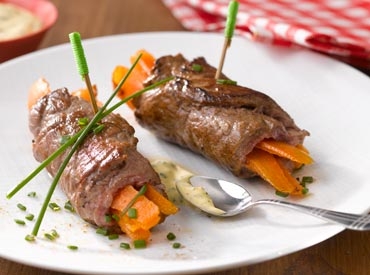 | Préparation : 1. Éplucher les carottes et les laver. 2. Les tailler en fines lanières à l’économe. 3. Plonger deux minutes dans l’eau bouillante, et rafraîchir. 4. Disposer les 4 tranches de salers sur une planche. Saler, poivrer. 5. Répartir les lanières de carottes. Saler et poivrer. 6. Rouler et piquer d’un pique à brochette. 7. Déposer les jaunes d’oeuf dans une casserole, ajouter la cuillère à soupe de vinaigre balsamique, 2 cuillères à soupe d’eau et le beurre en parcelles. 8. Fouetter sur feu très doux jusqu’à obtenir une sauce onctueuse. 9. Ajouter la pointe de cumin, le cerfeuil et la ciboulette concassée. 10. Sauter les Saltimbocca à la poêle et déguster avec la béarnaise. |