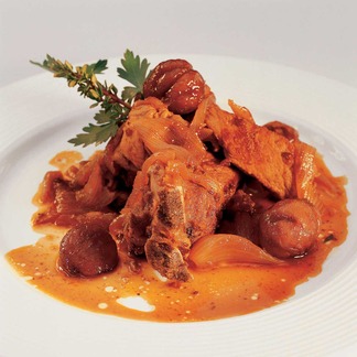 | Préparation : Éplucher, laver et émincer les oignons. Couper la viande en morceaux (sans la désosser : la chair se tiendra mieux à la cuisson). Dans une cocotte, faire chauffer le beurre et l`huile, y faire revenir les morceaux de viande sur toutes leurs faces jusqu`à coloration. Assaisonner. Retirer la viande. Dans cette même cocotte, retirer l`excédent de graisse, y faire suer les oignons. Déglacer avec l`eau-de-vie, faire réduire légèrement et verser le cidre. Ajouter le bouquet garni et les épices. Cuire à couvert 40 à 50 minutes à feu doux (ou au four à 190°C (th.6)). 10 minutes avant la fin de la cuisson, ajouter les châtaignes. Servir bien chaud ! |
