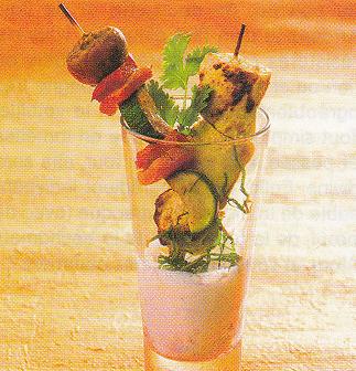 | Préparation : Pour les brochettes de poulet : 1. Préparez la marinade en mélangeant tous les ingrédients. 2. Coupez le poulet en cubes. 3. Faites mariner le poulet dans la moitié de la marinade pendant 30 minutes au frais. 4. Enfilez les cubes de poulet sur des piques à brochettes. Pour les brochettes de légumes : 1. Taillez tous les légumes en rondelles ou en cubes. Faites-les blanchir 2 minutes dans de l`eau bouillante. 2. Enfilez les légumes sur des piques à brochettes en alternant. 3. Faites cuire les brochettes de poulet et de légumes au barbecue 15 minutes. 4. Décorez avec la menthe. Servez les brochettes avec le reste de sauce au yaourt. |