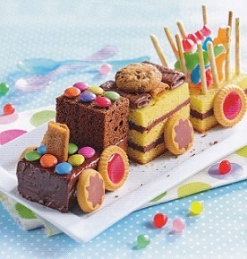 | Préparation : Faites fondre le chocolat au bain-marie avec le beurre. Hors du feu ajoutez la pâte à tartiner. Taillez dans les quatre-quarts sur environ 4 cm d`épaisseur : * 1 grand rectangle de 5 x 10 cm * 1 petit rectangle de 5 x 4 cm * et plusieurs rectangles de 5 x 7 cm Posez le petit rectangle sur le grand rectangle de façon à faire la locomotive. Les rectangles moyens formeront les wagons. Glacez la locomotive avec le chocolat fondu. Laissez une heure au frais. Coupez les wagons en tranche et garnissez de ganache. Déposez la locomotive et les wagons sur un plat de service rectangulaire. Placez les biscuits ronds à la base de la locomotive. Décorez avec les biscuits et les bonbons. Collez ces éléments avec la pâte à tartiner si nécessaire. |