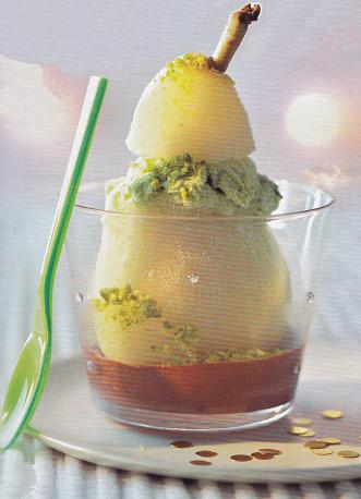 | POIRES FARCIES GLACE PISTACHE ET GANACHE CHOCOLAT AU LAIT | Préparation : 30 min Cuisson : 30 min |