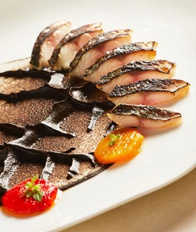 | Préparation : Maquereau Lever les filets de maquereaux et enlever les arêtes. Tailler les filets en biseaux. Presser le citron et mélanger avec le vinaigre de riz. Saler, poivrer, rehausser de piment d’Espelette. Six minutes avant de dresser, mariner les maquereaux dans cette préparation. Les passer ensuite à la salamandre ou sous un grill très chaud pendant 1 minute. Caviar d’aubergine "brûlée" Laver et essuyer les aubergines, les clouter de petits morceaux d’ail. Disposer dans un plat allant au four et arroser d’huile d’olive. Cuire à 230 °C pendant 15 minutes puis baisser le four à 110 °C pendant 20 minutes. Au terme de la cuisson, retirer la chair en gardant la peau. Mixer un tiers de la pulpe avec la peau assaisonnée de sel et de poivre. Monter à l’huile d’olive et mettre à refroidir. Tuiles croustillantes Mélanger la farine de pois chiche avec l’eau et l’huile d’olive. Filtrer au chinois étamine. Dans une poêle à crêpe chaude, faire des disques de 10 cm de diamètre. Les retirer et mettre sur un papier absorbant pendant 2h. Poivrons marinés Laver et sécher les poivrons. Les mettre à cuire dans un plat allant au four avec 4 gousses d’ail éclatées et une branche de thym pendant 25 minutes à 180 °C. Au terme de la cuisson, retirer la peau et les graines. Les détailler selon votre goût. Montage Dresser tous les éléments selon la photo. |