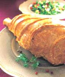 | Préparation : Épluchez les gousses d`ail, détaillez-les en éclats et piquez-en le gigot en divers endroits. Enduisez le gigot de beurre ou d`huile d`olive. Salez, poivrez-le, mettez-le dans un plat allant au four préalablement beurré. Faites cuire à four très chaud (plus de 220°), comptez 30 min (la cuisson de la viande s`achèvera sous la croûte), laissez refroidir. Pendant ce temps, préparez la farce, faites blondir les échalotes dans un peu de beurre. Ajoutez les carottes coupées en fines rondelles, le hachis, laissez cuire quelques instants, puis ajoutez le jambon braisé coupé en petits dés et le vin blanc. Laissez cuire 20 minutes environ. Déroulez la pâte feuilletée et disposez en son milieu la farce tiède et par-dessus le gigot refroidi. Recouvrez-le entièrement avec la deuxième pâte en laissant simplement le manche apparent. Étendez les chutes de pâte restantes, découpez-les à la roulette de pâtissier et décorez l`enveloppe de feuilleté à votre gré. Faites une cheminée dans la pâte. Battez le jaune d`oeuf et avec un pinceau badigeonnez la pâte. Placez le gigot en croûte à four moyen (environ 180°) 40 minutes, le temps pour la pâte de cuire et de prendre une belle couleur dorée. Servez immédiatement. |